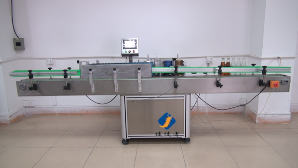 看到上圖中玻璃瓶子后面有一條螺旋狀黑色柱體了嗎?那個圓柱體就把瓶子們的間距調(diào)節(jié)得與出標頻率吻合,瓶子們被一個個送到下圖這個傳送帶上進行貼標,傳送帶會準確地把已經(jīng)糊好漿糊的標簽給貼上瓶子,如下圖: