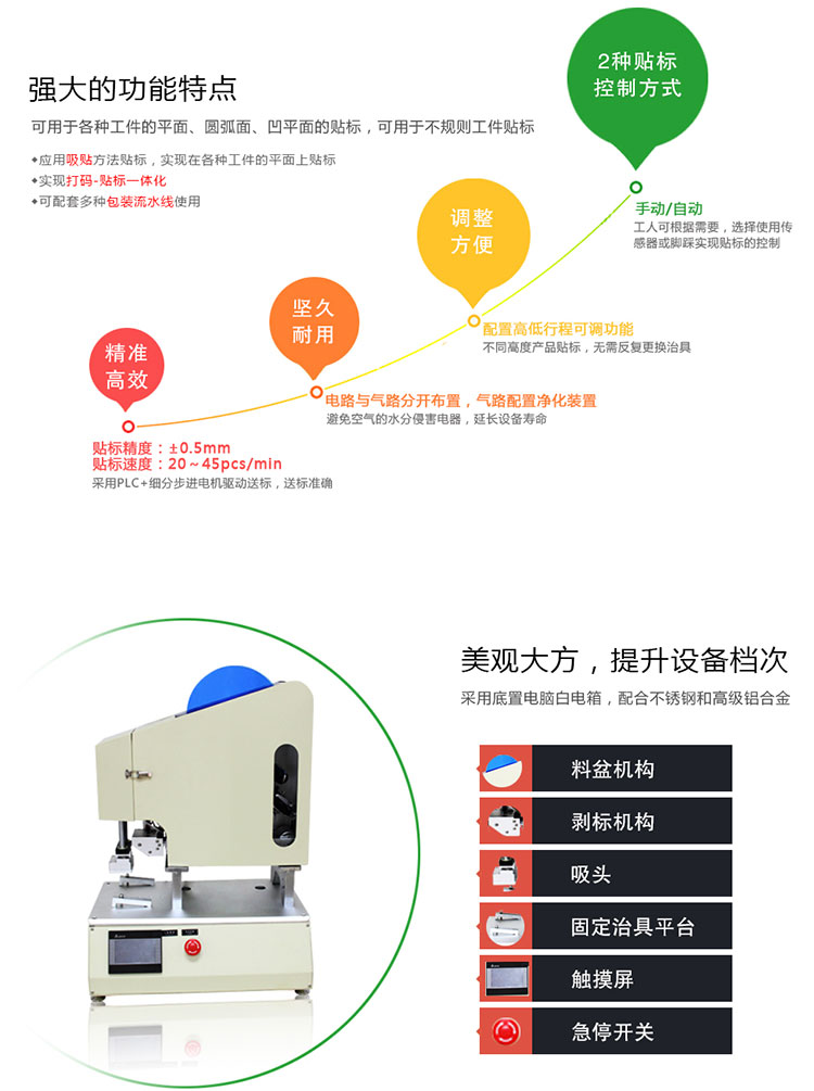 更改覆標機構,可適用于不平整面貼標,如凹平面、圓弧面的貼標等。